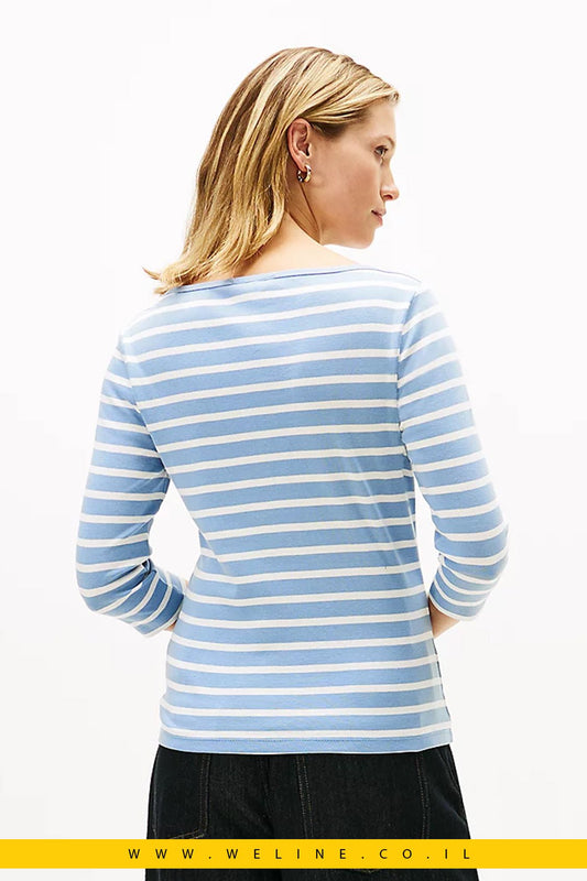 חולצת טי נשית ומעודנת מבית Tommy Hilfiger בגזרת Slim Fit צבע מים צלולים / פס אקרו
