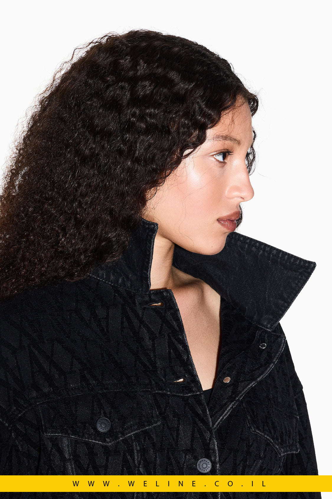 וייב של דנים – אבל בגרסה הכי מתוחכמת שיש. ג'קט ג'ינס שחור עם דוגמת מונוגרמה בכל הבד, שמעניק מראה יוקרתי, חד ומלא נוכחות.
