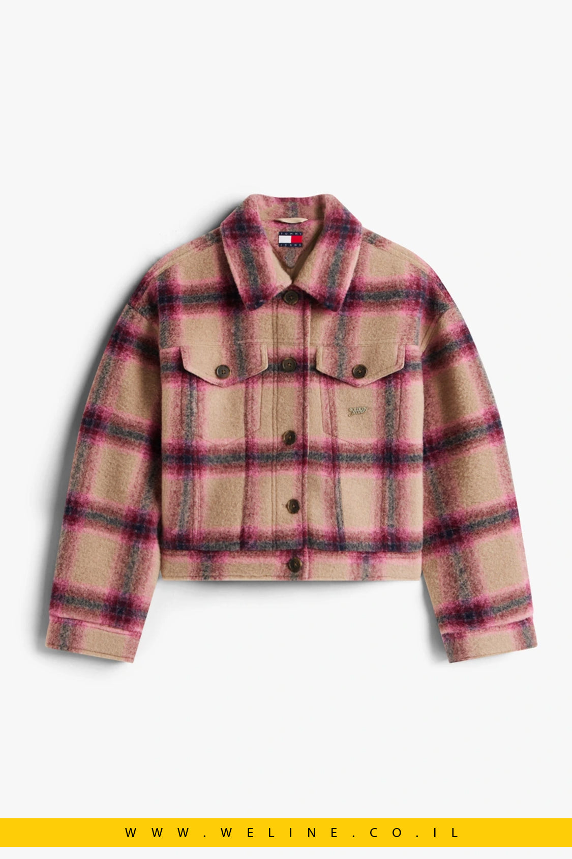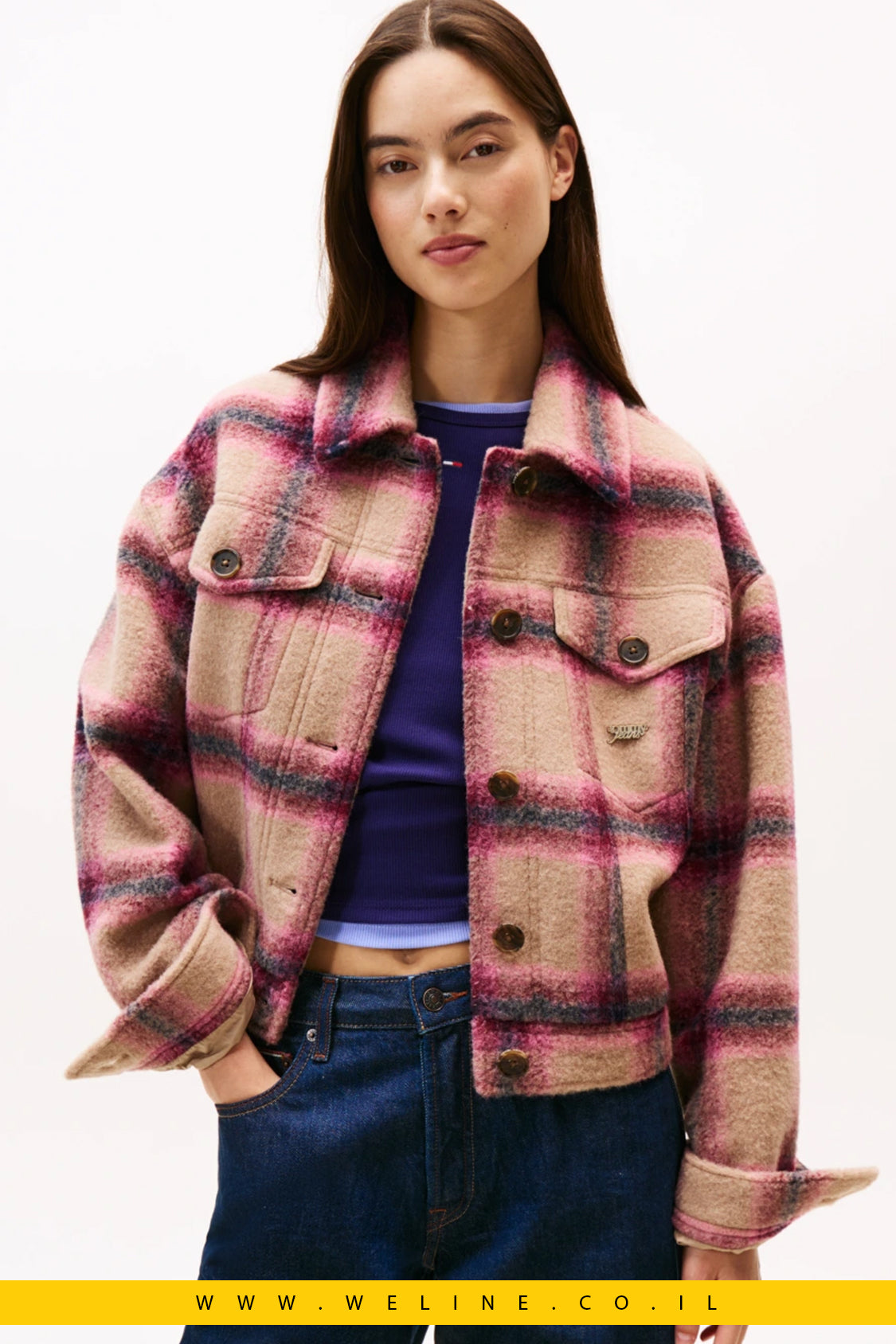 Tommy Jeans ג׳קט נשים, ג׳קט טרקר צמר לנשים, ג׳קט משובץ ורוד, מעיל נשים Tommy Jeans, ג׳קט חורף אופנתי לנשים, Mystic Pink jacket, wool blend trucker jacket women, Tommy Jeans women jacket