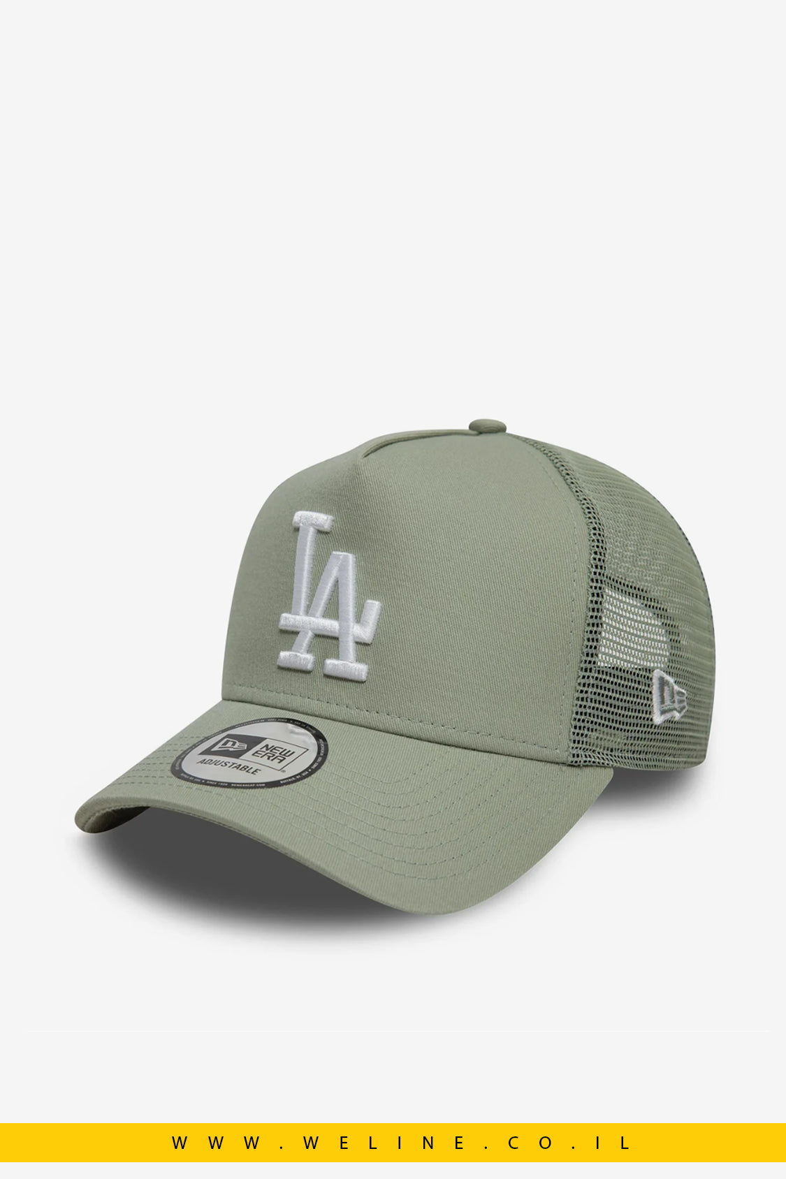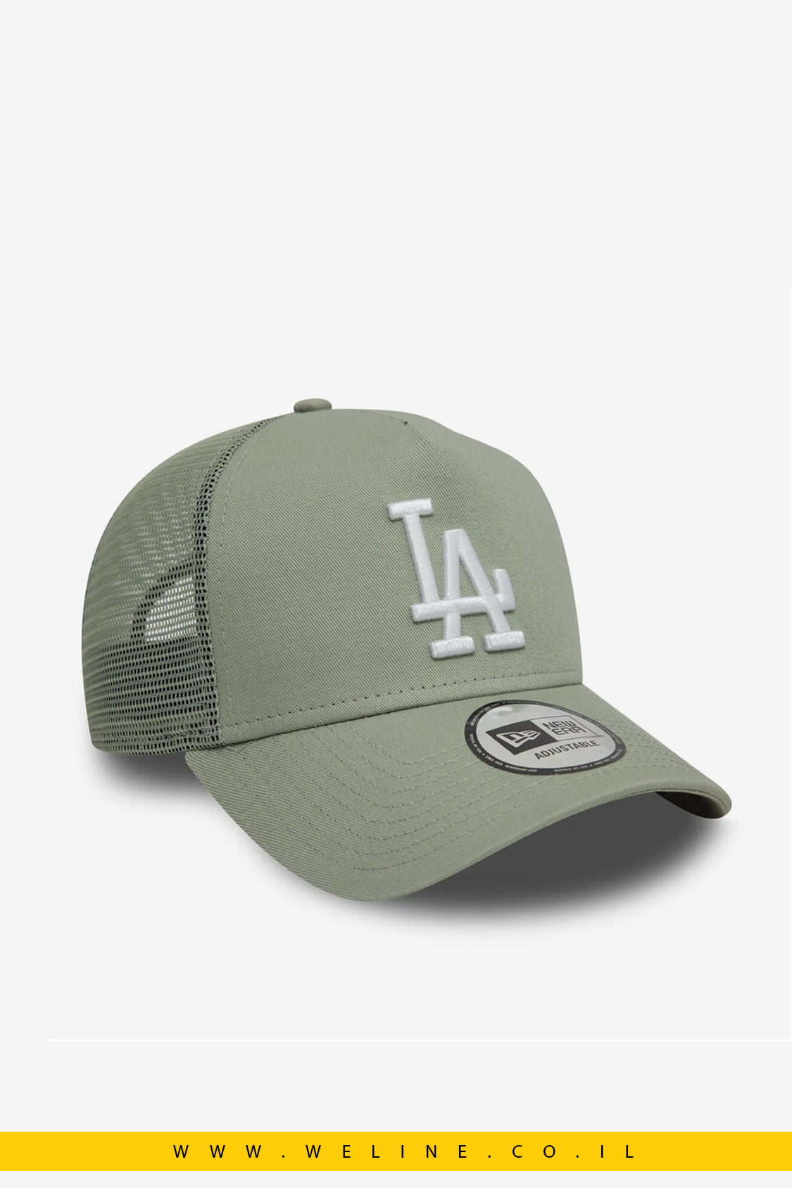כובע בייסבול בסגנון טרקר עם גזרה מחויטת ורשת אוורירית בגב, בעיצוב בצבע ירוק פסטל ייחודי עם לוגו LA Dodgers מבית New Era.