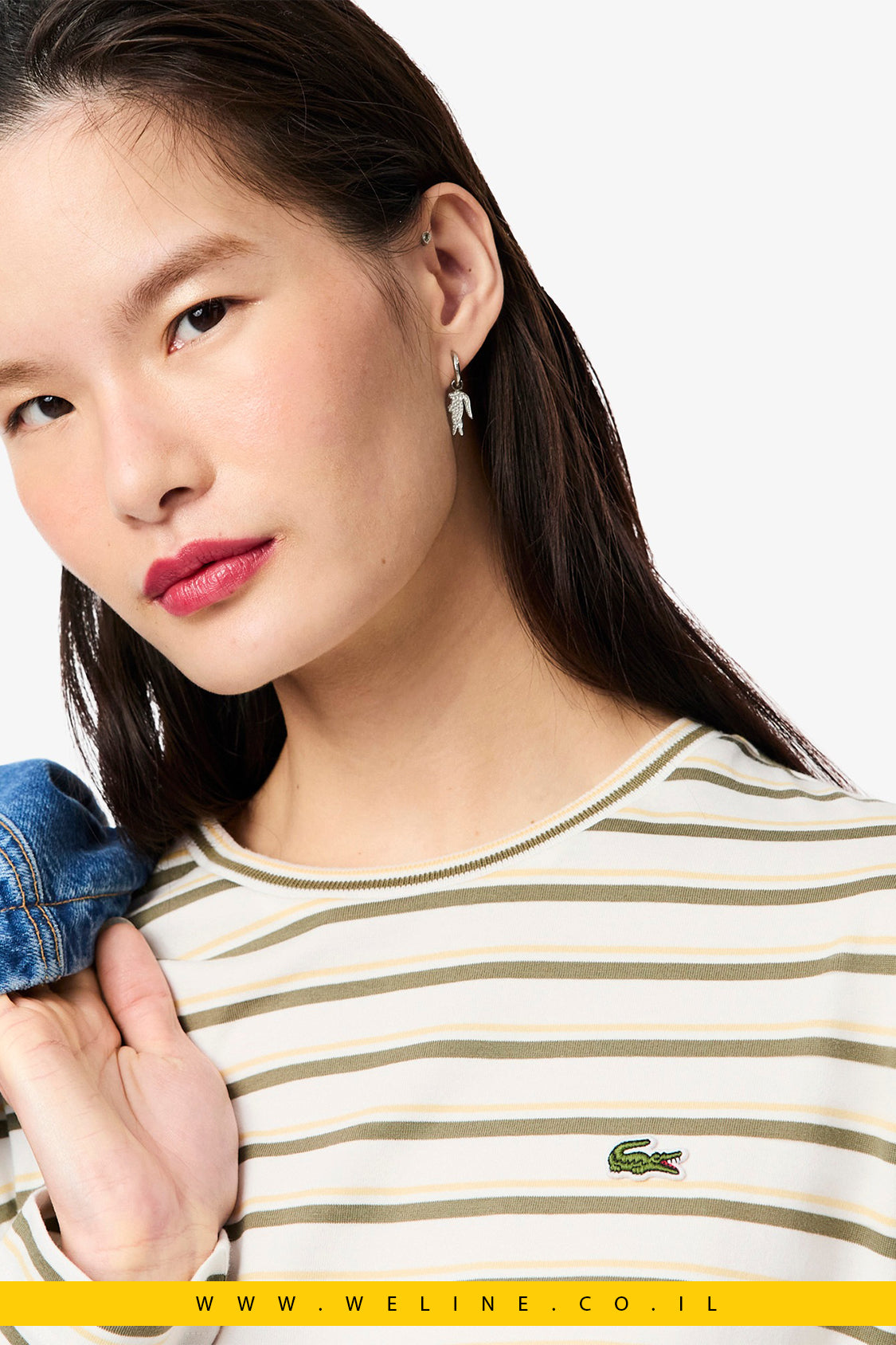 חולצת נשים אלגנטית מבית Lacoste, המשלבת עיצוב קלאסי עם נוחות עילאית. עשויה מבד כותנה אורגנית מסוג ג׳רזי (Organic Cotton Jersey), רך ונושם, בעיצוב פסים דו-גווני דק ועדין לכל אורכה.