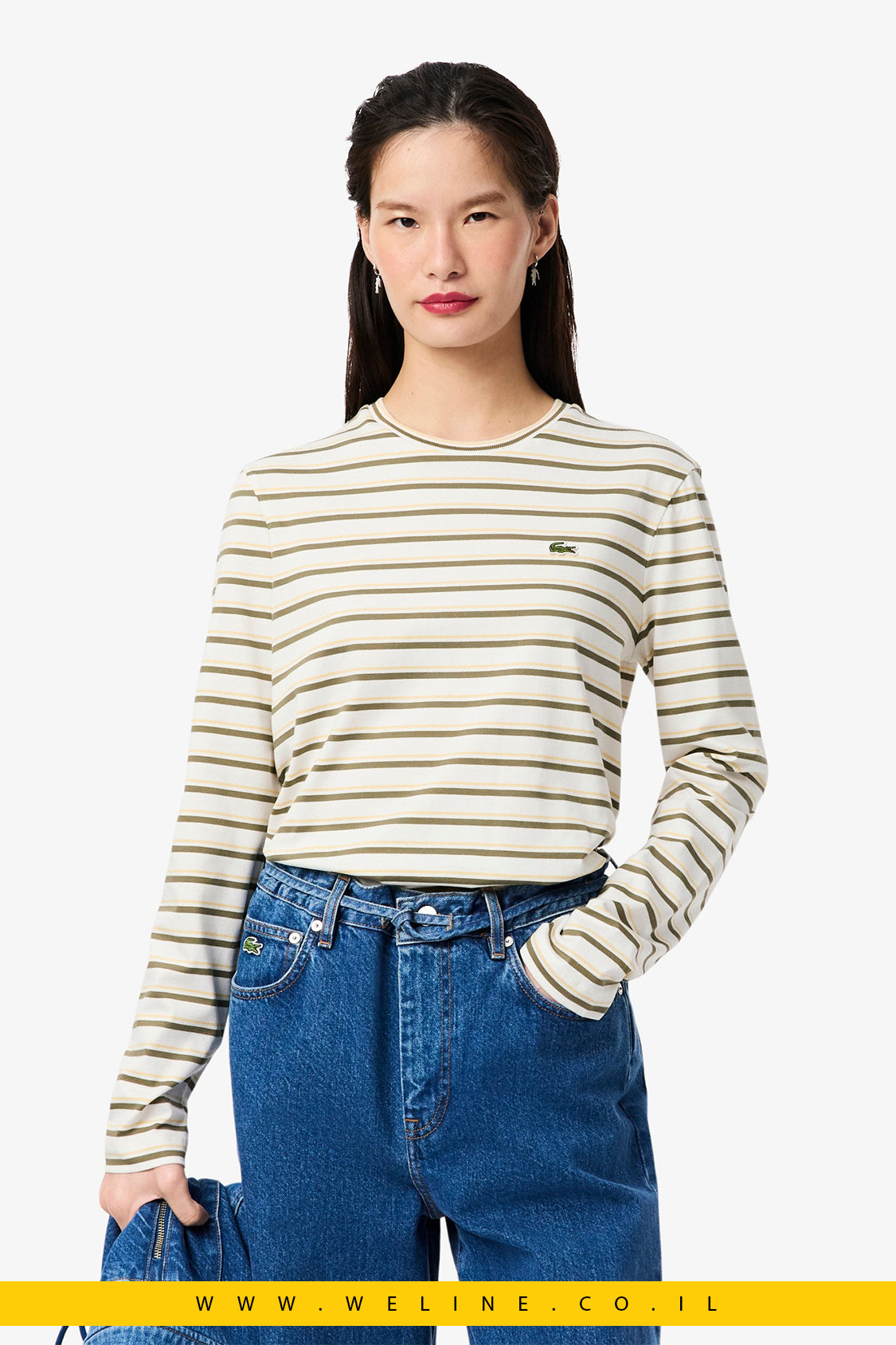 Lacoste Women's T-shirt, חולצת נשים לקוסט, Long Sleeve Striped Shirt, חולצת פסים נשים, חולצת ג׳רזי ארוכה, חולצת כותנה אורגנית נשים, אופנת נשים צרפתית