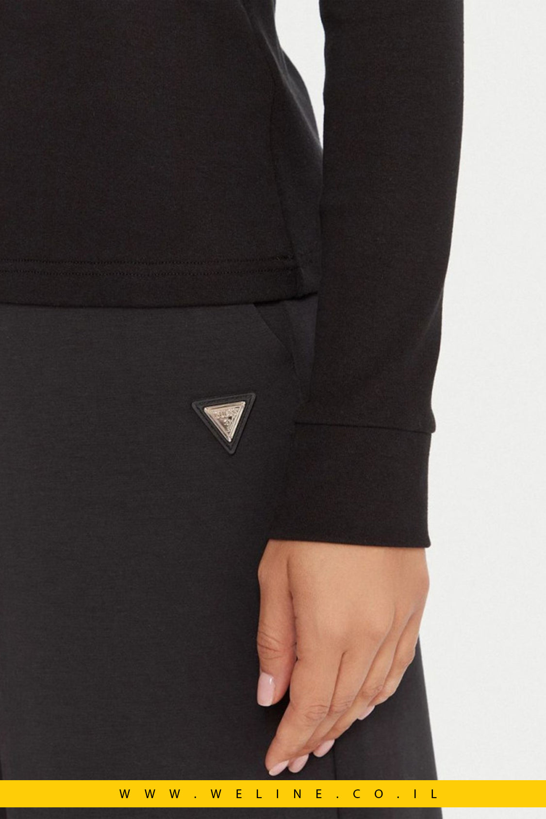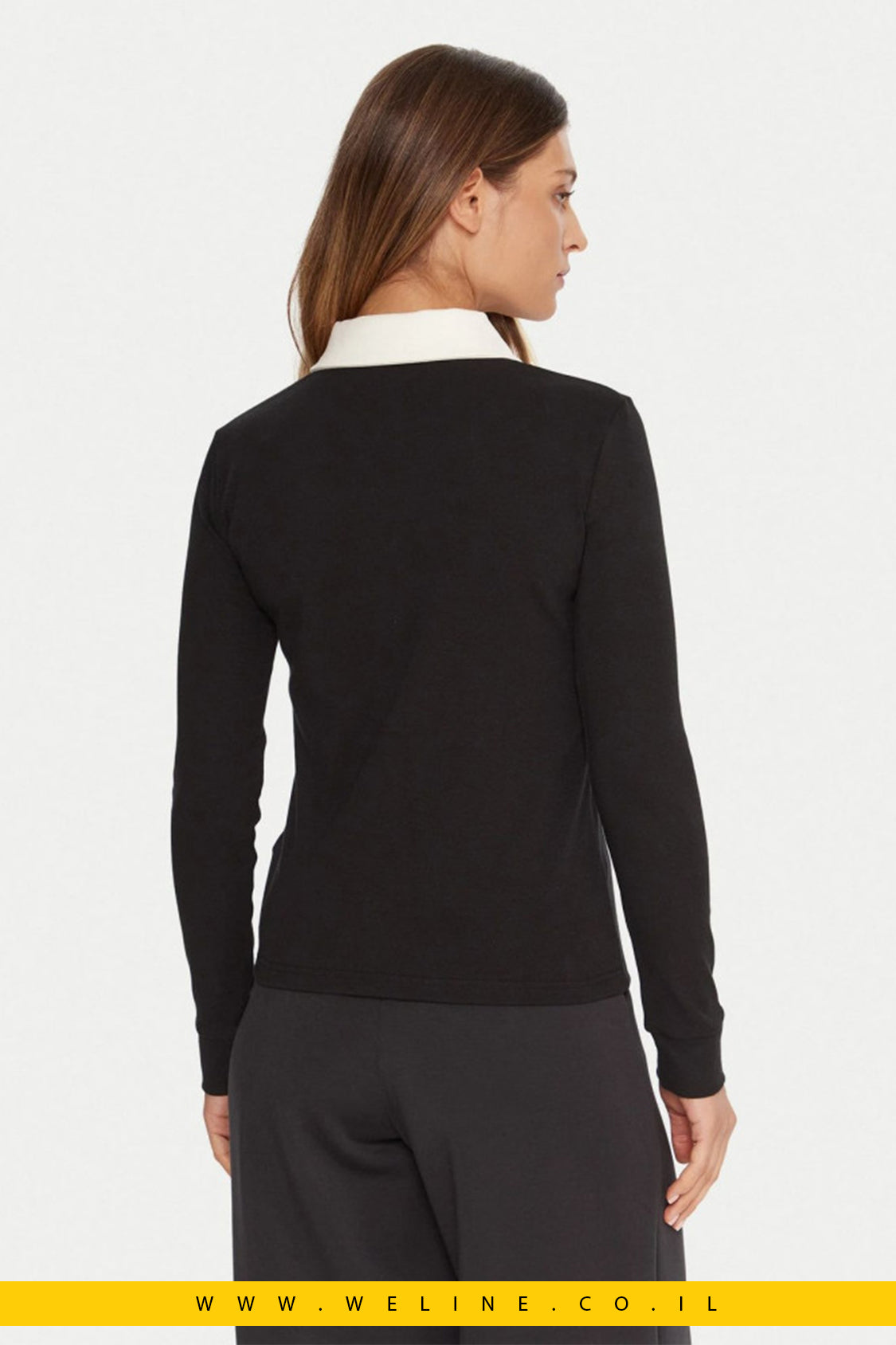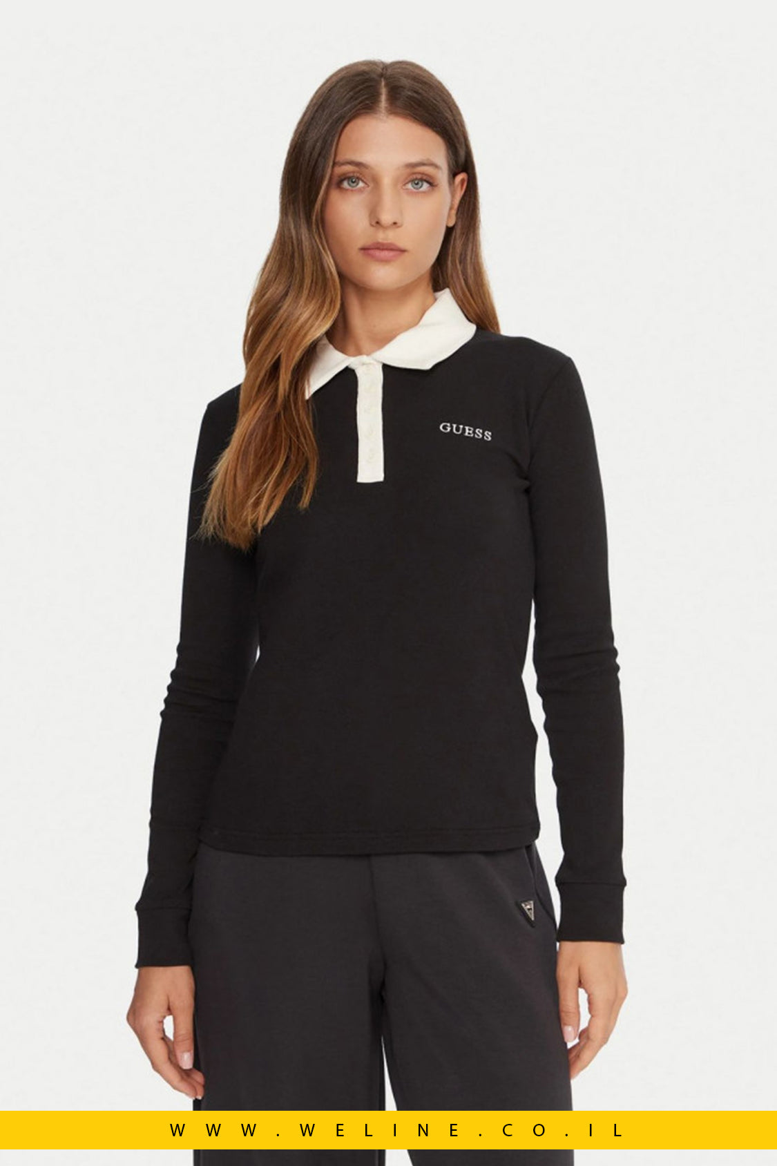 Guess נשים, חולצת פולו שחורה, חולצת פולו אלגנטית לנשים, Guess Fabia, חולצת כותנה עם אלסטאן, חולצה שחורה עם צווארון לבן.
