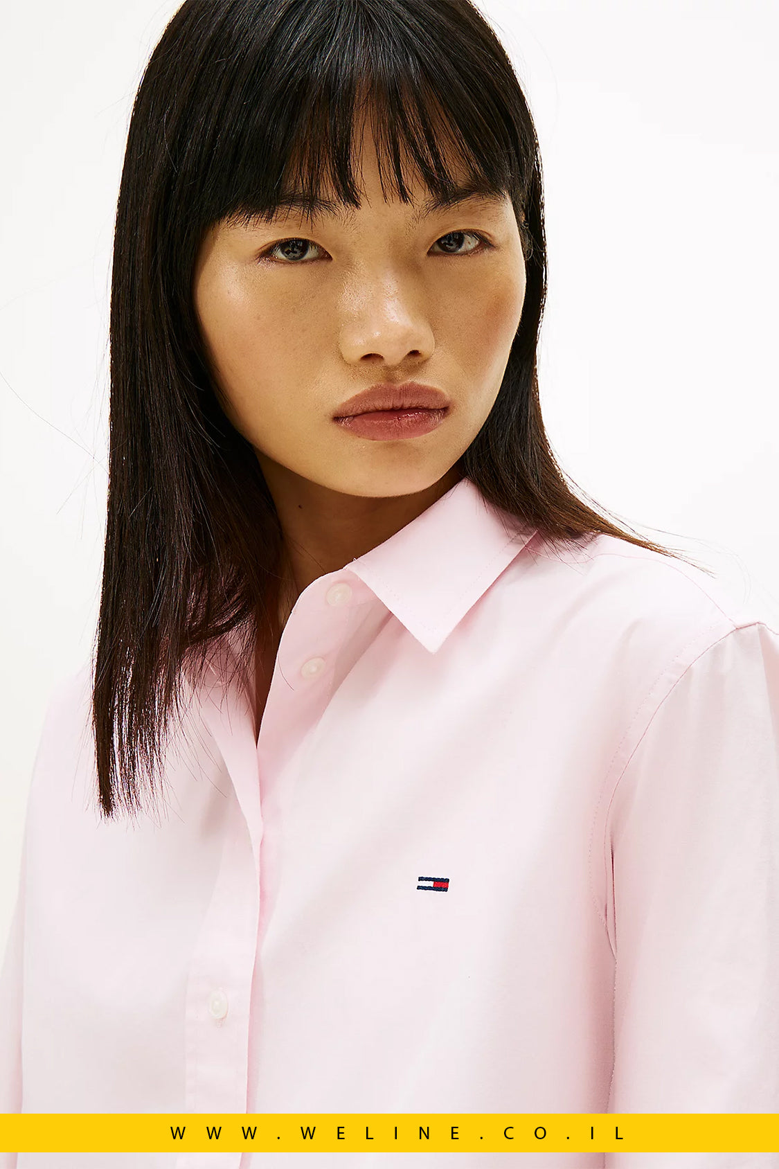 חולצת פופלין לנשים, חולצת קרופ ורודה, Tommy Jeans נשים, חולצה מכופתרת קרופ, חולצת כותנה 100%, חולצה אלגנטית יומיומית, relaxed fit shirt, cropped poplin shirt, חולצת מעבר לנשים, חולצה ורוד בהיר טומי ג’ינס, לוק קז’ואל אלגנט, חולצה לנשים עם רקמת דגל Tommy