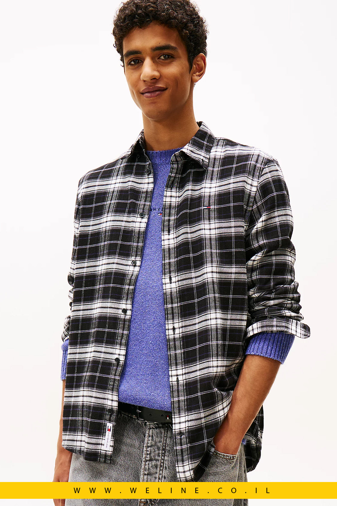 חולצת פלאנל משובצת לגברים Tommy Jeans • Regular Fit Check Flannel Shirt • פלאנל כותנה 100% • שחור משבצות • חולצות לגברים חורף