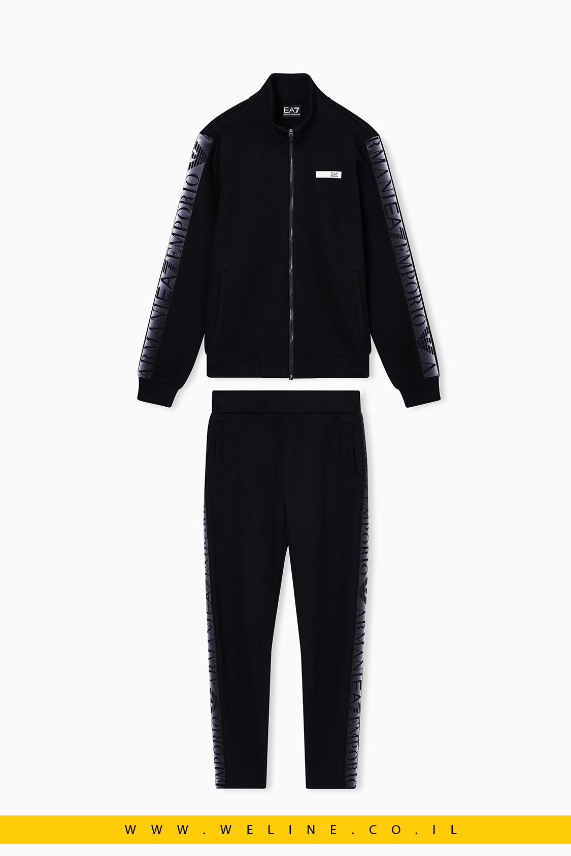 חליפת אימון מינימליסטית ונקייה מבית EA7 Emporio Armani, עשויה מבד טכני מתקדם Natural VENTUS7 – שילוב ייחודי של סיבים טבעיים וסינתטיים המווסת את טמפרטורת הגוף.