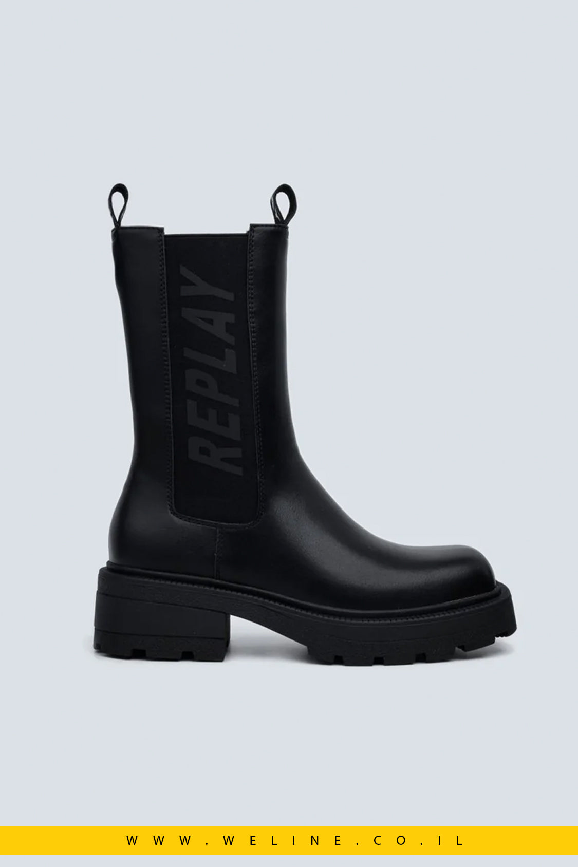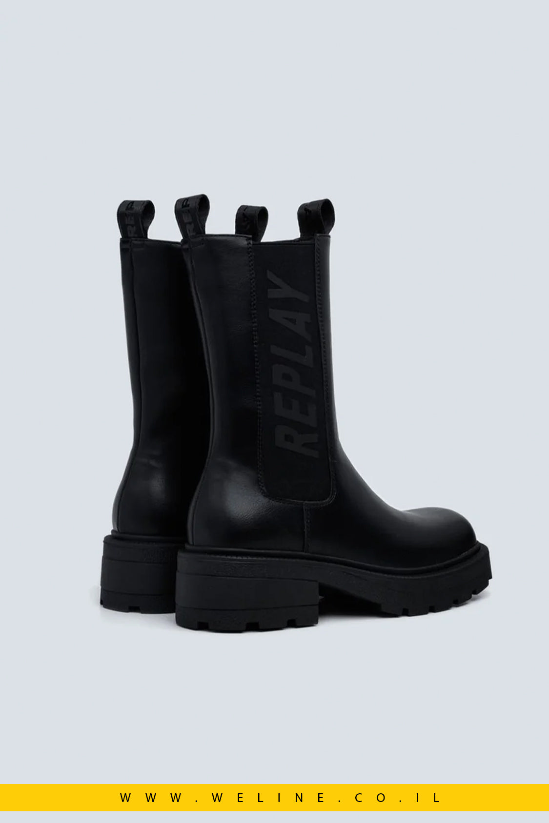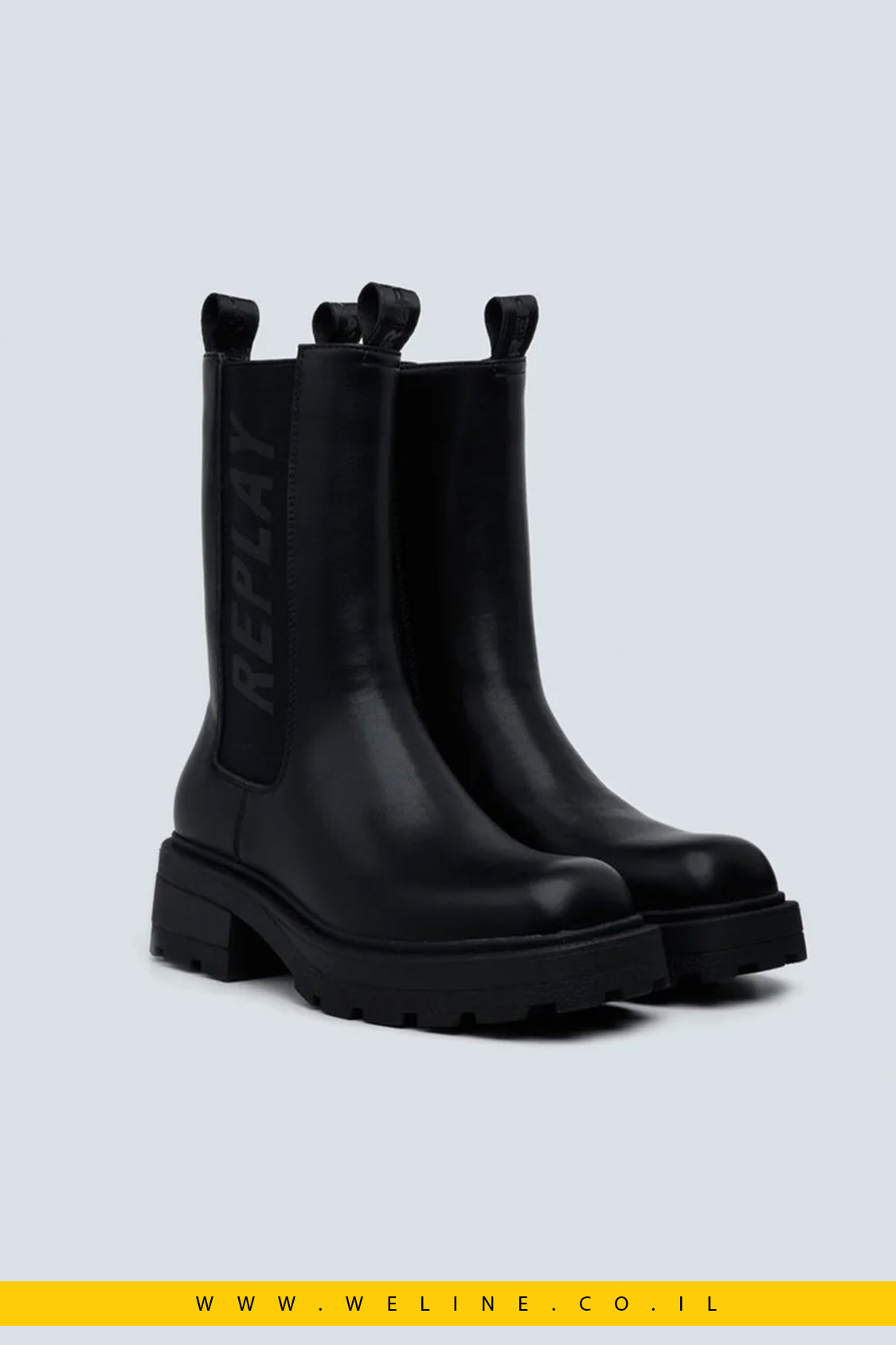 מגפי צ’לסי גבוהים בסגנון בייקר בעיצוב אלגנטי ונקי בגוון שחור. הדגם כולל אלסטיק צד רחב לנעילה מהירה ונוחה, עם לוגו REPLAY טונאלי למראה יוקרתי ומוקפד. הגפה עשויה דמוי־עור חלק ועמיד, יחד עם לולאות משיכה לתחבולה קלה ומהירה. הסולייה הטרקטורית העבה מספקת יציבות, אחיזה ובטחון בכל צעד — מושלמים לעונה הקרה.