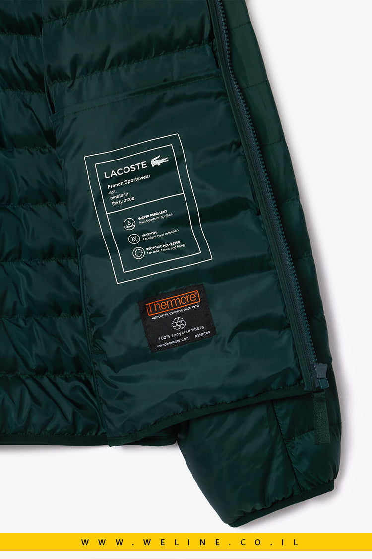 המעיל הנמכר ביותר של Lacoste מציע פתרון טכני מעולה לחודשי החורף. עיצובו החמים והקליל כולל ציפוי דוחה מים ומילוי סיבים חדשני המספק הגנה אופטימלית מפני מזג האוויר. המעיל הפרקטי והורסטילי מתאים ללבישה בפני עצמו או מתחת למעיל נוסף.