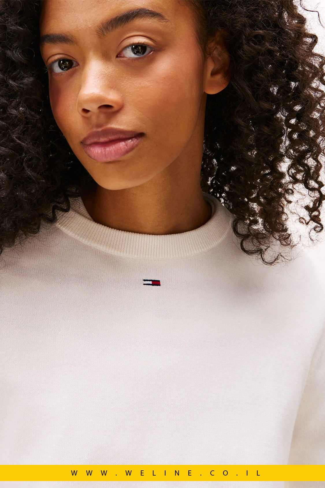 Tommy Jeans נשים, סוודר נשים כותנה, סוודר Tommy לבן, סוודר עם דגל רקום, סוודר קלאסי לנשים, אופנה אמריקאית יוקרתית