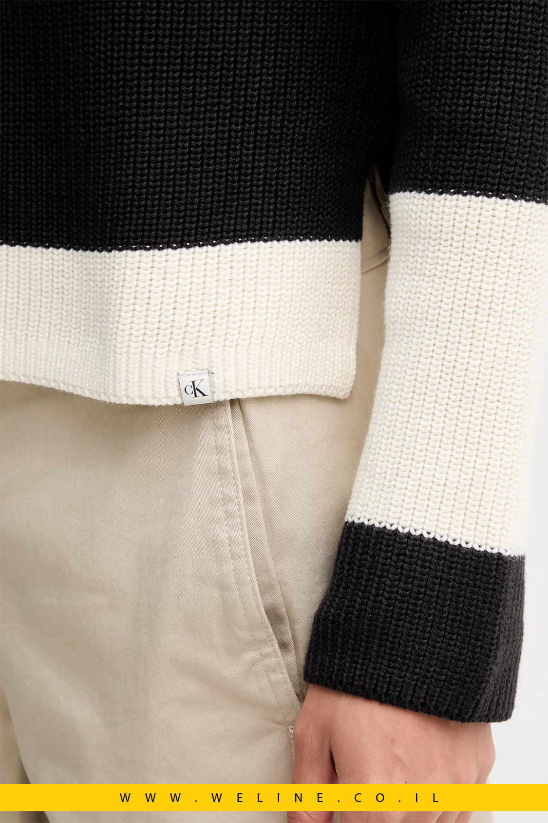 Calvin Klein Jeans נשים, סוודר שחור נשים, סוודר חצי גולף נשים, סוודר כותנה נשים, סוודר חורף רפוי, סריג Calvin Klein.