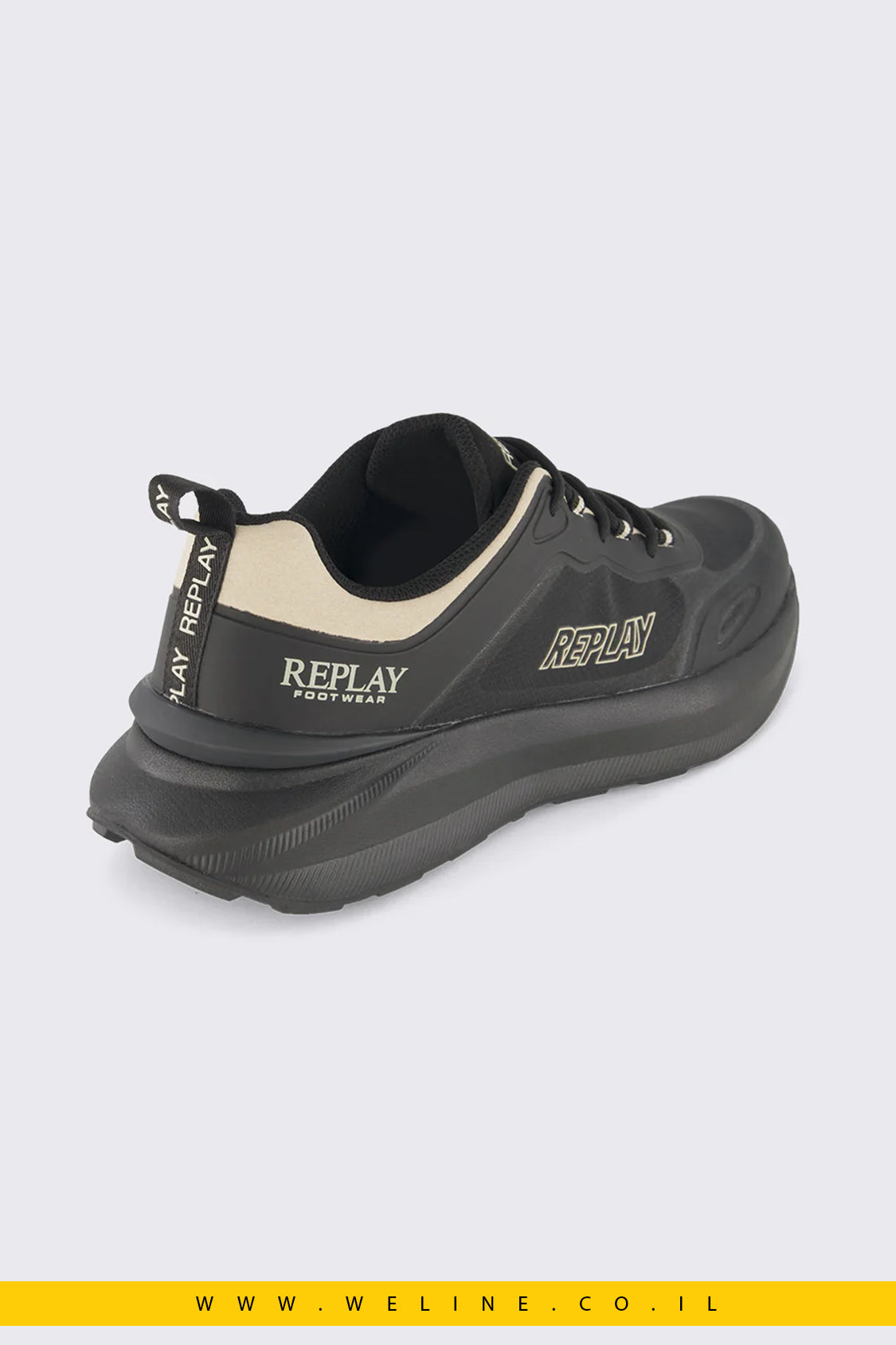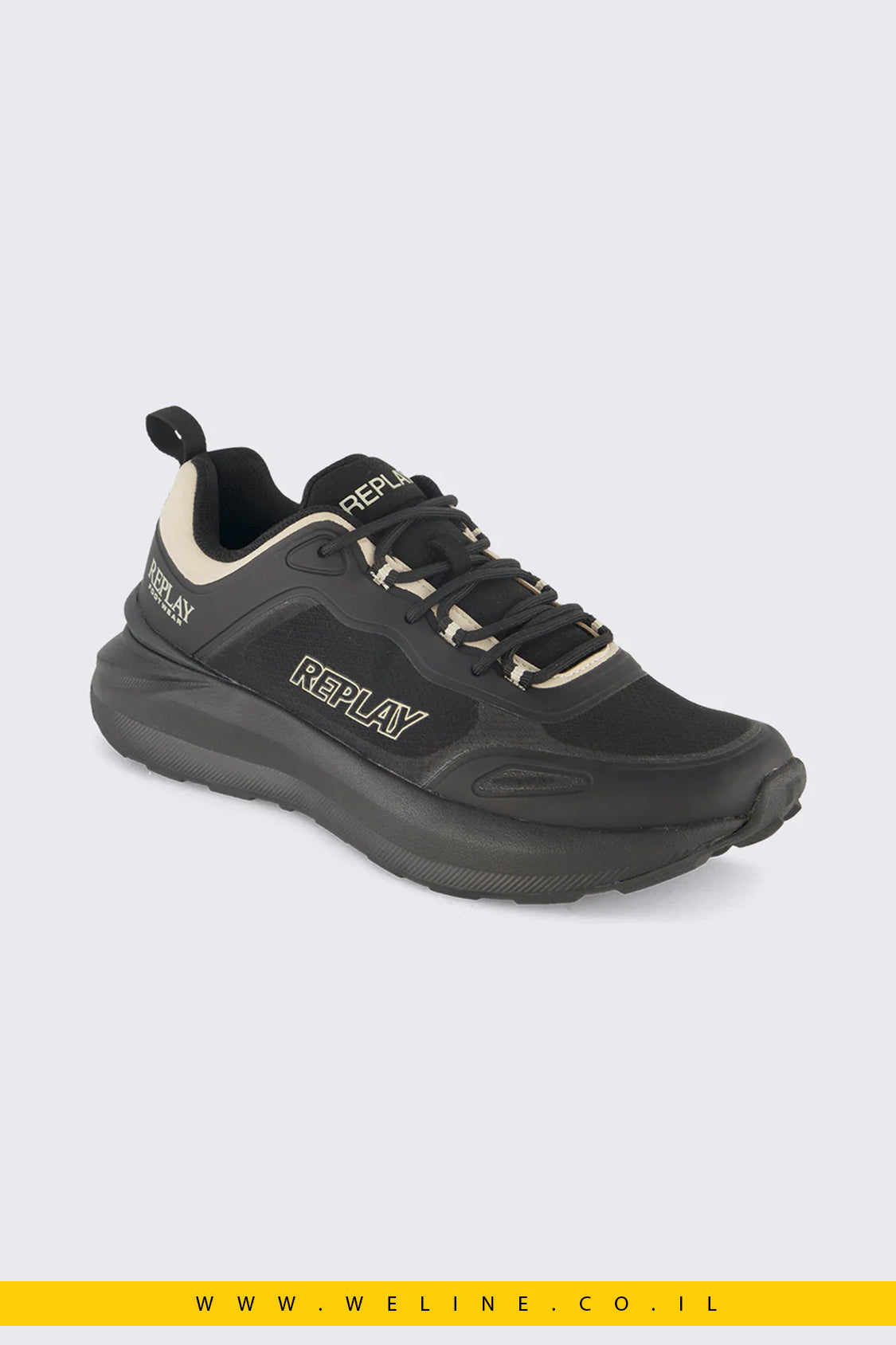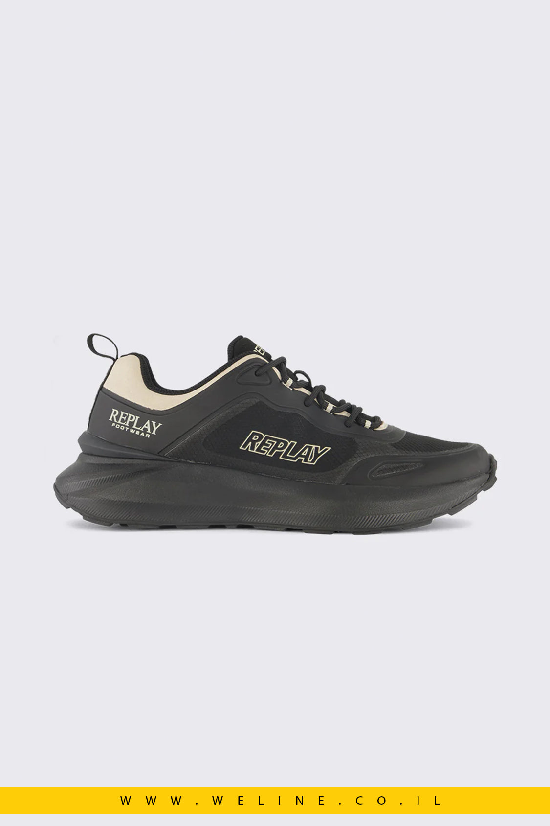 סניקרס לגברים בעיצוב מודרני בצבע בז׳ עם נגיעות שחור. הדגם משלב בד רשת ונגיעות סינתטיות לנ透ות ונוחות מירבית. סוליית EVA עבה וקלה מספקת ריכוך מצוין ויציבות, עם לוגו REPLAY בולט בצד לנגיעה אופנתית. מתאימות לשימוש יומיומי ולמראה ספורטיבי־אורבני נקי.