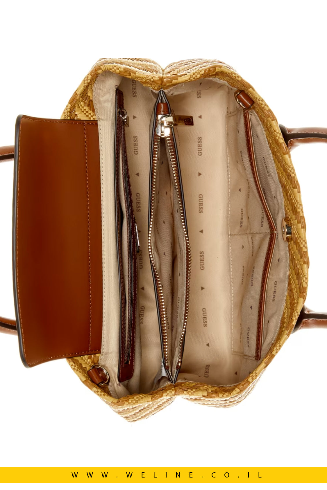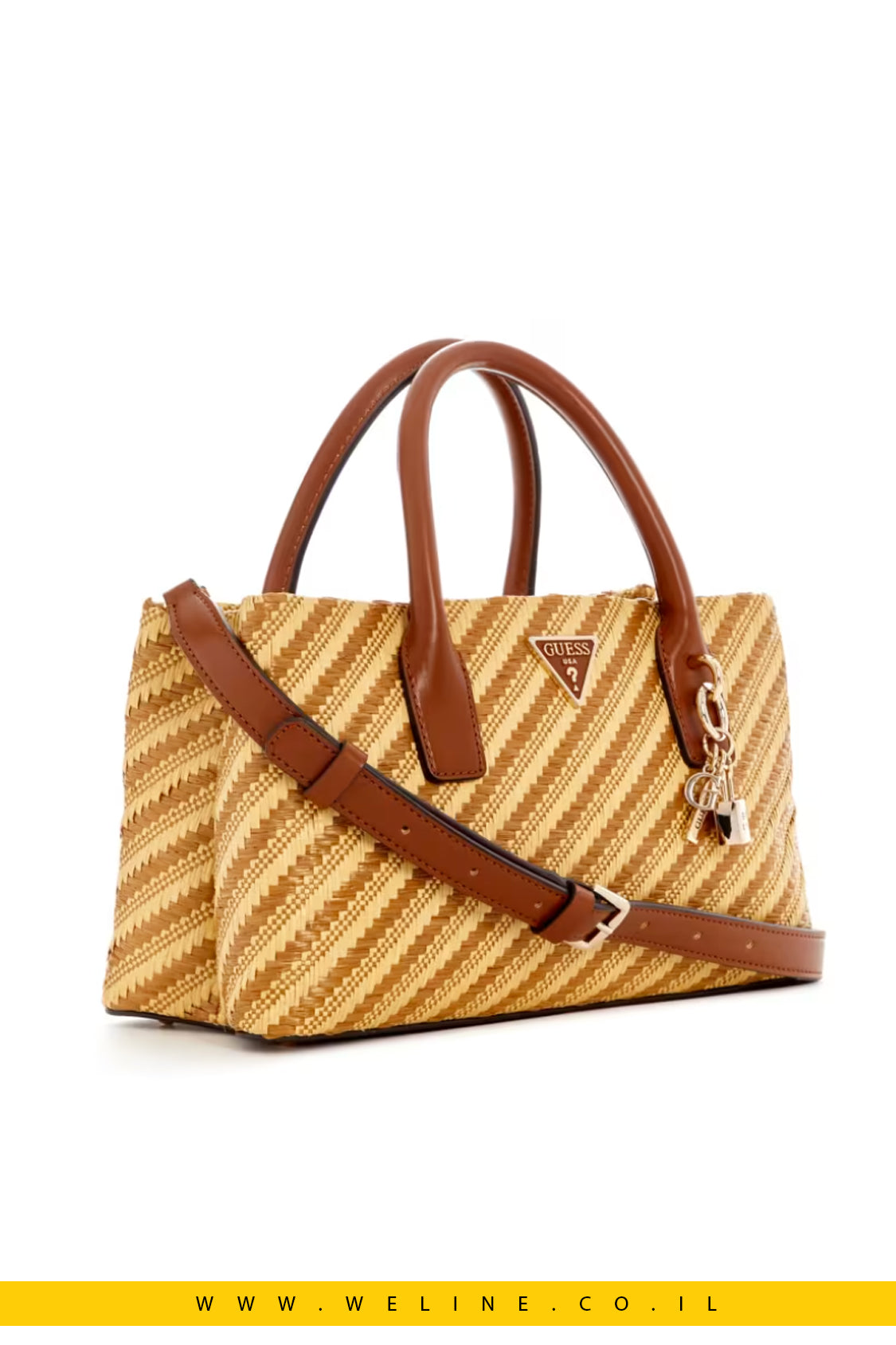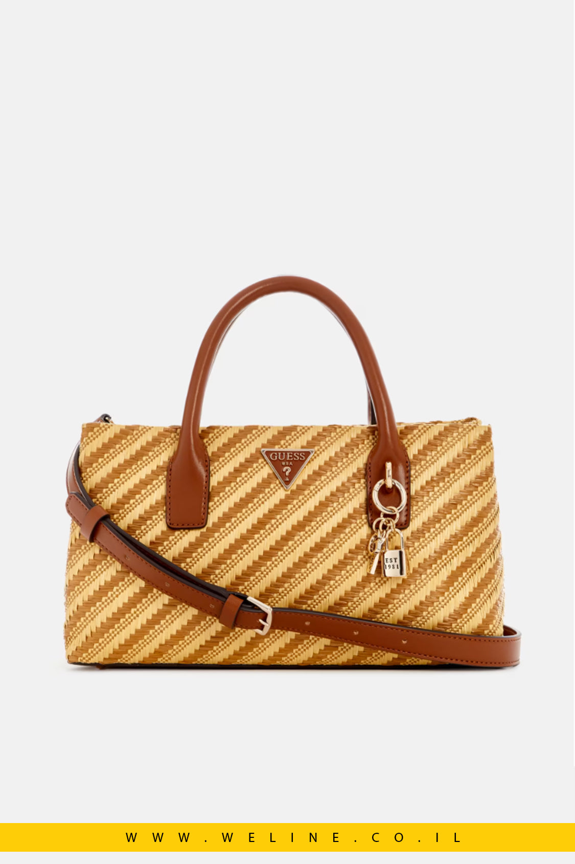 תיק סאטצ’ל קטן בעיצוב קלאסי של GUESS, משלב חומרי קש ארוגים עם גימורי דמוי עור חלק. מתאים לשימוש יומיומי עם טאץ’ קייצי יוקרתי, סמל משולש אמייל מוזהב, ותא אחד מרווח לאחסון חכם.