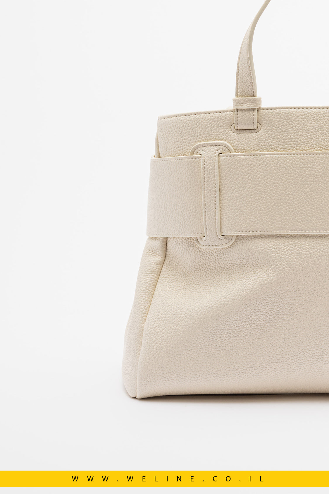תיק שופר אלגנטי בצבע לבן מבית Armani Exchange, עשוי מעור סינטטי במרקם גרעיני המעניק מראה יוקרתי וייחודי. כולל רצועת כתף נשלפת לפרקטיות מרבית ועיטור חגורה דקורטיבית עם לוגו מתכתי מרשים.